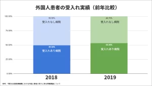 また、同期間での外国人患者受け入れ人数の平均は34.1人(中央値8人)。前年の2018年に行われた調査では受け入れ人数の平均は24.3人(中央値4人)でした。その他、受け入れ人数が「11人~50人」だった医療機関の数は前年580から726、「51~100人」は128から183と増加。受け入れ機会だけでなく受け入れ人数も増加しています。