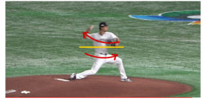 仮に、上下胴が一緒に回旋した場合、手投げになってしまい上手くボールに力が乗らず速い球が投げられませんし、コントロールも悪くなります。